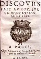 • "Libre discovrs fait av roy, svr la conclvsion de la paix." Paris: Abraham Savgrain, 1516 [i.e., 1616].