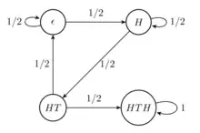 The first state represents the empty string, the second state the string "H", the third state the string "HT", and the fourth state the string "HTH". Although in reality, the coin flips cease after the string "HTH" is generated, the perspective of the absorbing Markov chain is that the process has transitioned into the absorbing state representing the string "HTH" and, therefore, cannot leave.