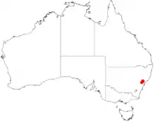 It is endemic to an area in eastern New South Wales[1] where it has a restricted range around Howes Mountain area and around Mount Murwin and the Yengo National Park area where it is commonly situated on hillslopes and ridges among and over sandstone bedrock or outcrops or where areas of shale meet sandstones. It is found growing in sandy to sandy clay soils as a part of Eucalyptus woodlands or open forest communities as a part of the shrub understorey.[2]