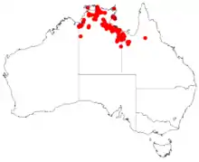 It is native in the Northern Territory from around Darwin south and east in Arnhem Land and on many of the islands in the Gulf of Carpentaria. Its range extends into far north-western Queensland where it is found on hills and sandstone slopes growing in skeletal sandy soils.[1]