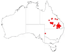 It has a limited distribution in an area of south-eastern Queensland in the western parts of the Darling Downs and around Maranoa where it grows in shallow gravelly or loamy sandy soils often over sandstone as a part of scrubland communities where it can form dense thickets.[1]