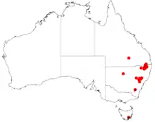It is found along the tablelands of the Great Dividing Range from north-eastern New South Wales from around Torrington in the south extending to south eastern Queensland to around Dalveen in the north. It is found in sandy granite based soils as a part of forest communities.[1]