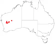 It has a discontinuous distribution throughout an area of the Mid West region of Western Australia roughly centred around Wiluna where it is found on flats along creeks and river beds, breakaways and crests of low rises growing in loamy soils with ironstone gravel and stones or calcrete soils with laterite and quartz.[2] Most of the population is found in the Murchison region around Mount Magnet, near Sandstone and Cue.[1]