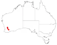 It has a disjunct distribution from around Kununoppin in the north to Lake Grace in the south where it grows in gritty clay and loam soils as a part of Eucalyptus woodland and mallee scrub communities.[3]