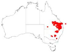 It is endemic to the inland parts of south-eastern Queensland and north-eastern parts of New South Wales from around Moura in the north and Gilgandra in the south where it is found on hills and plains growing in sandy and alluvial soils. It is commonly found in disturbed area and as a part of open Eucalyptus woodland or forest communities that are often dominated by species of Callitris.[2][3]