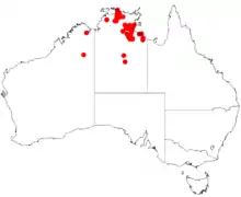 It is endemic to tropical areas in the Northern Territory where it is usually situated along creeks, in gullies or on sandstone hills where it is often found in colonies growing in alluvium or stony sandy soils as a part of shrubland, savannah grassland, Eucalyptus woodland or wet forest communities.[2]