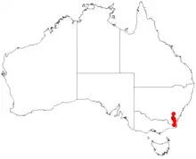 It is native to south eastern parts of New South Wales between Captains Flat though to Bombala where it is found on rocky slopes as a part of dry sclerophyll forest and heath communities.[1] It is mostly situated at an altitude of around 1,200 m (3,900 ft) on granitic slopes or in gullies or occasionally in heath on the margins of swamps as a part of Eucalyptus forest or woodland.[2]