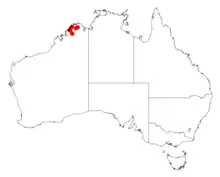 It is native to an area in the east Kimberley region of Western Australia[2] where it has widespread but quite localised populations from around the Prince Regent River in the south west to around the Roe River in the north and to the Drysdale River National Park in the east.[1] The wattle is spread over a range of approximately 200 km (120 mi) and is usually situated on among rocks on ridges composed of quartzite or sandstone or of more massive sandstone pavements in small stands where it is often part of scrubland communities including Acacia kenneallyi, Hibiscus superbus, Macarthuria vertex and species of Triodia and Triumfetta.[1]