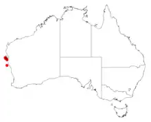 It occurs on East Wallabi Island in the Houtman Abrolhos as well as scattered locations near Shark Bay including Dirk Hartog Island and Carrarang and Tamala Stations[2]