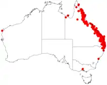 It is endemic to the coastal regions of Queensland and northern New South Wales extending into the adjacent tablelands of the east in northern Queensland.[1] In New South Wales it occurs as far south as the Bellinger River where it is found along the edges of rainforest and behind coastal sand dunes as a part of wet sclerophyll forest and sclerophyll woodland communities.[2]