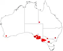 The erect, viscid shrub to tree typically growing to a height of 2 to 5 metres (7 to 16 ft). The plant tends to divide near the base to form a series of main stems. It flowers from July to November producing yellow flowers, it fruits from December to January.[2]
