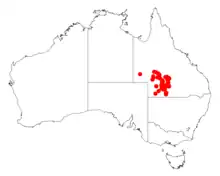 The tree is found in a small area of South West Queensland and the bulk of the population is found on and around the Gray Range with a scattered distribution extending out to Adavale in the north and to around Thargomindah in the south where it is found on low hills growing in clay loam soils.[2] It is part of mulga shrubland communities and found along eastern border of the Simpson Desert ecoregion.[4]