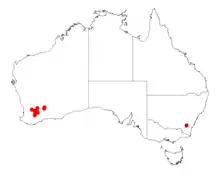 It is endemic to an area in the Wheatbelt and Goldfields regions of Western Australia where it grows in gravelly, sandy and loamy granitic soils. The bulk of the population is found between Quairading and Kulin[2] and is a part of shrubland communities.[1]