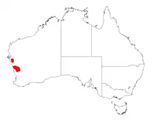 It is native to an area in the Mid West and Wheatbelt regions of Western Australia where it grows in flats, sandplains, low rises and ridges in stony sandy soils.[1] The bulk of the population is found from Mingenew in the north to Perenjori and Wubin in the south.