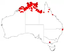 It is found across northern Australia in Western Australia, the Northern Territory and the Gulf Country of north east Queensland.[1] In Western Australia is native to a small area in the Kimberley region where it grows in sandy soils over sandstone or laterite.[3] The tree is part of in and around the edges of monsoon forest and in open forest communities found in sandstone gorges.[1]
