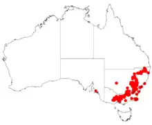 The species occurs in New South Wales, Victoria and the Australian Capital Territory.[1] It was first formally described by botanist Allan Cunningham in Geographical Memoirs on New South Wales in 1825.[1] He described it as "a shrub frequent on rocky barren ranges in the interior".[1]