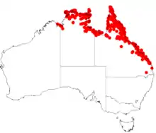 It is mostly found in open forest, but will also grow in monsoon forest and rainforest margins. The natural range extends from Carlton Hill Station in the Kimberley region of Western Australia eastwards across the Top End of the Northern Territory to Cape York Peninsula and southwards to Southern Central Queensland where it is found along the margins of watercourses and swampy areas[2] growing in sandy or rocky soils occasionally around laterite as a part of open Eucalyptus or Melaleuca woodland communities.[3]