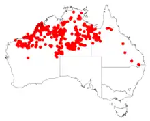 It occurs on red sand, ironstone or lateritic soils in pindan, and on stony plains and rocky ridges. In northern Western Australia it is found in the Central Kimberley, Central Ranges, Dampierland, Gibson Desert, Great Sandy Desert, Little Sandy Desert, Northern Kimberley, Ord Victoria Plain, Pilbara and Tanami IBRA bioregions.[1]