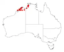 It is native to Kimberley region of Western Australia where it is found in clay or lateritic soils over laterite or basalt.[1] The range extends to the east as far as Noonamah, found to the south of Darwin with populations found in the Litchfield and Daly River catchments as well as around the Victoria River where it is found on rocky slopes and plateaux as a part of woodland communities.[2]