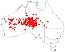 The plant grows in a variety of environments across Australia, although in Western Australia it is much more restricted and will only grow in sandy or clay soils and is often found on stony plains and in clay-pans[3] in and around drainage lines or alluvial or stony to hard-pan plains where it grows in gilgai clay or heavy loam soils as a part of low woodland communities that can feature Acacia aneura , Acacia catenulata and Acacia distans as well as species of Eremophila.[1]