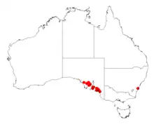 It is endemic to some small areas on the Eyre Peninsula in South Australia near Arno Bay extending to the Yorke Peninsula near Curramulka and then between the Gilbert River and Monarto where it is found growing in calcareous sandy or sandy-loamy soils as a part of open scrubland communities[3] that are dominated by Eucalyptus species.[2] The total area over which the shrub is found has been calculated as 4,976 km2 (1,921 sq mi).[1]
