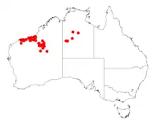 It is native to an area in the Northern Territory and the Goldfields-Esperance and Pilbara regions of Western Australia. It usually grows in sand dunes around the Eremaean Province and Northern Province with very arid landscapes and red brown coloured sandy soils.[2] The shrub has a discontinuous distribution within the Pilbara region from coastal areas between Port Hedland and Cossack in the west to Marble Bar and Shay Gap, Western Australia. It also occurs further north from around Mandora extending eastward to the Great Sandy Desert and the Little Sandy Desert. It also located in the Northern Territory in the Tanami Desert where it is often a part of spinifex communities.[1]