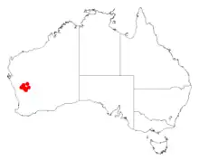 It is native to an area in the Mid West and Wheatbelt regions of Western Australia where it is commonly situated on rocky hills growing in stony gravel or sandy soils over or around ironstone.[1] It has a disjunct distribution over a limited range from around Mount Farmer Station in the west to Yalgoo in the east where it is usually a part of open shrubland communities.[2]