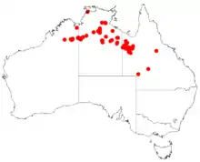 In Western Australia it is found only in the Kimberley region.[2] It is also found through the top end of the Northern Territory and parts of Western Queensland.[3] The plants are often situated on dissected plateaux and rocky low hills, stony or sandy plains and along diffuse drainage lines mostly growing in skeletal and slightly acidic rocky sandy soils.[1]