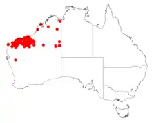 It is endemic to an area in the Kimberley, Goldfields and Pilbara regions of Western Australia where it is usually found along creeks and rivers growing in stony sandy soils.[3] The population is mostly found to the west of the Hamersley Range with the distribution becoming more scattered in the Kimberley region and eastwards toward the border. It will sometimes forming thickets on coastal pindan sandplains in the Pilbara region. It is commonly part of the Acacia pyrifolia and Acacia coriacea subsp. pendens woodland communities on alluvial plains and washes.[1]