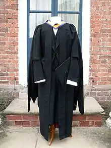 - Bachelors etc. - A robe of black silk or stuff of the shape special to the University. The gown is of the traditional masters' shape with the boot of the sleeve cut into the shape of an 'M', a distinction unique to the university, designated [m18] under the Groves classification system.