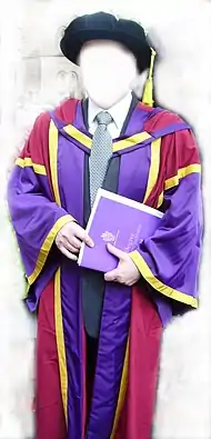 - Other Doctorates - maroon (woollen) cloth fully lined with purple carried over as an edging on the cape;