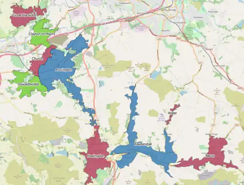 The Acrrington/Rossendale Built-up area is an urban area which extends from the town of Accrington to the towns of Haslingden, Rawtenstall, Waterfoot and Bacup in Lancashire, England. The area takes in parts of the boroughs of Hyndburn and Rossendale and includes villages and hamlets that surround Accrington, Rawtenstall and Bacup. The area was recorded at having a population of 125,059.[1][2] The area was two separate urban areas according to the 2001 census [3] but were combined into one for the 2011 census. According to the 2001 census the Accrington urban area had a population of 71,000 whilst the Rossendale Urban Area had a population of 49,000.[3]