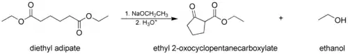 - The Dieckmann condensation, where a molecule with two ester groups reacts intramolecularly, forming a cyclic β-keto ester. In this case, the ring formed must not be strained, usually a 5- or 6-membered chain or ring.