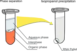 This method relies on phase separation by centrifugation of a mixture of the aqueous sample and a solution containing water-saturated phenol and chloroform, resulting in an upper aqueous phase and a lower organic phase (mainly phenol). Guanidinium thiocyanate, a chaotropic agent, is added to the organic phase to aid in the denaturation of proteins (such as those that strongly bind nucleic acids or those that degrade RNA). The nucleic acids (RNA and/or DNA) partition into the aqueous phase, while protein partitions into the organic phase. The pH of the mixture determines which nucleic acids get purified.[3] Under acidic conditions (pH 4-6), DNA partitions into the organic phase while RNA remains in the aqueous phase. Under neutral conditions (pH 7-8), both DNA and RNA partition into the aqueous phase. In a last step, the nucleic acids are recovered from the aqueous phase by precipitation with 2-propanol. The 2-propanol is then washed with ethanol and the pellet briefly air-dried and dissolved in TE buffer or RNAse free water.