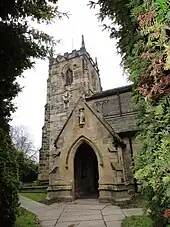 The first recorded mention of a church in Ackworth appears in the 1086 Domesday Book: "There is a Church there, and priest."[12] Before this, it is thought there had been a church in Ackworth from about 750.[8] Ackworth is noted in the porch of a Durham church as one of the places where the body of St Cuthbert was taken by monks from Lindisfarne as they journeyed round the country with his body in 875–882.[30] The Church of St Cuthbert in the centre of High Ackworth is believed to have been dedicated when the monks stopped on their pilgrimage.[30][31] The original church is believed to have been replaced in the 14th century with a stone church and tower. The tower remains, but the church was renovated and restored in 1852–1854, when it is thought that the roof was lifted and additional windows added. All the present stained glass windows date from that time.[30] The restoration followed a 1852 fire that damaged the nave and chapel. During the restoration, remains of an earlier Norman chapel were found.[31] The church was declared a Grade II listed building in 1968.[32]