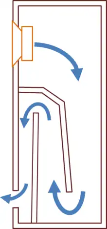 In practice, the duct is folded inside a conventional shaped cabinet, so that the open end of the duct appears as a vent on the speaker cabinet. There are many ways in which the duct can be folded and the line is often tapered in cross section to avoid parallel internal surfaces that encourage standing waves. Depending upon the drive unit and quantity – and various physical properties – of absorbent material, the amount of taper will be adjusted during the design process to tune the duct to remove irregularities in its response. The internal partitioning provides substantial bracing for the entire structure, reducing cabinet flexing and colouration. The inside faces of the duct or line, are treated with an absorbent material to provide the correct termination with frequency to load the drive unit as a TL. A theoretically perfect TL would absorb all frequencies entering the line from the rear of the drive unit but remains theoretical, as it would have to be infinitely long. The physical constraints of the real world, demand that the length of the line must often be less than 4 meters before the cabinet becomes too large for any practical applications, so not all the rear energy can be absorbed by the line. In a realized TL, only the upper bass is TL loaded in the true sense of the term (i.e. fully absorbed); the low bass is allowed to freely radiate from the vent in the cabinet. The line therefore effectively works as a low-pass filter, another crossover point in fact, achieved acoustically by the line and its absorbent filling. Below this “crossover point” the low bass is loaded by the column of air formed by the length of the line. The length is specified to reverse the phase of the rear output of the drive unit as it exits the vent. This energy combines with the output of the bass unit, extending its response and effectively creating a second driver.