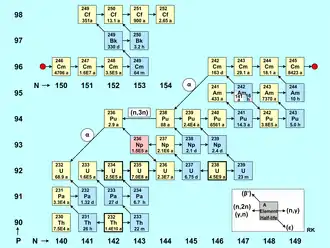 The figure buildup of actinides is a table of nuclides with the number of neutrons on the horizontal axis (isotopes) and the number of protons on the vertical axis (elements). The red dot divides the nuclides in two groups, so the figure is more compact. Each nuclide is represented by a square with the mass number of the element and its half-life.[68] Naturally existing actinide isotopes (Th, U) are marked with a bold border, alpha emitters have a yellow colour, and beta emitters have a blue colour. Pink indicates electron capture (236Np), whereas white stands for a long-lasting metastable state (242Am).