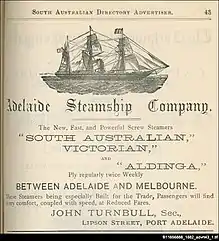 Its promoters and founding directors included Andrew Tennant,[19] Robert Barr Smith[20] and Thomas Elder[21] of Elder Smith & Co Ltd. The first ship of the new company was Flinders.[22] In July 1876 the company's leading promoters amalgamated their private ship-owning interests to form the Spencer's Gulf Steamship Co Ltd, trading in South Australian coastal waters. The two companies amalgamated in December 1882.[23] The fleet circled the coast from Derby in northern Western Australia to Cairns in northern Queensland.[22] Shipping operations were supported by a large network of agency offices in almost every major Australian port.[3]
