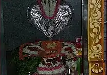 The Om Sakthi Stage at the entrance. On the highway in front of the Siddhar Peetam there is a stage with the mantra of "OmSakthi" on it. Soolam (Trishul - Trident) of the Mother is erected on this stage. The devotees entering the Peetam to worship the Mother, first go round this stage thrice and then enter the Peetam. Since the AdhiParaSakthi is the Mother Origin of everything, there is no Nava Grahas (9 Planets) that are usually found in all other Hindu Temples. The Mother has ascertained, "Those who surrender to me, need not pray to the planetary Lords. They are my officers who carry out the work of implementing my Law of Karma. The Sanctum Sanctorum faces the entrance where OM Sakthi stage is located. Inside this sanctorum is the Swayambu and Mother's idol. The sanctorum is only about 10X10 feet room."