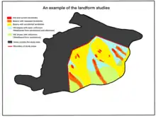 Regolith mapping can also be used to determine disrupted natural landscapes in aerial photographs.[1] For example, agricultural terraces, which refers to the level land surfaces divided by short back slopes and concrete barriers, is one of the disrupted landscapes.[1] Back slopes refer to the slopes constructed by removing soil or rocks from hillslopes for nearby infrastructure. They were developed for the purpose of growing rice.[1] The terraces are usually found on gentle slopes and bottom areas of the mountains.[1] They are usually covered with thick vegetation when the terraces are abandoned, or the farming activities are no longer active.[1]