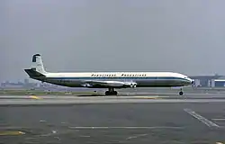 In the early 1960s, the fleet consisted of four Comet 4s, four Convair 240s, 15 DC-3s, six DC-4s, five DC-6s and six Sandringhams, whereas the ten F-27s ordered in 1957 were still pending delivery.[26] The 1960s saw the carrier ordering the Avro 748 turboprop airliner.[27] The aircraft started services on 15 February 1962 between Buenos Aires and Punta del Este.[11] The first flight for the Caravelle in Aerolíneas colors was Buenos Aires–Santiago de Chile on 1 April 1962.[11] At April 1965 the carrier had 5,960 employees, and the fleet consisted of three Comet 4s, one Comet 4C, three Caravelles, 12 DC-3s (three of them freighters), six DC-4s, three DC-6s and 12 HS-748s.[28] In 1966, loans granted by the Ex-Im Bank and Boeing permitted the purchase of a number of Boeing 707-320Bs in a deal worth US$37,000,000 (equivalent to $333,721,026 in 2022).[29] In November 1969, the carrier entered a pool agreement with Lufthansa covering services between Germany and Argentina.[30]