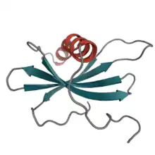 Affimer proteins were developed initially at the MRC Cancer Cell Unit in Cambridge then across two laboratories at the University of Leeds.[7][8][9][10] Derived from the cysteine protease inhibitor family of cystatins, which function in nature as cysteine protease inhibitors,[11][12] these 12–14 kDa proteins share the common tertiary structure of an alpha-helix lying on top of an anti-parallel beta-sheet.[13]