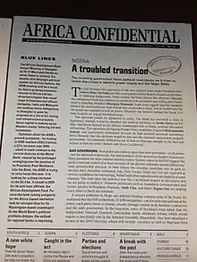 Africa Confidential is a fortnightly newsletter covering politics and economics in Africa. It was established in 1960[1] and is owned by the British company Asempa Limited. Founded by a group of six individuals under the banner of Miramoor Publications, Africa Confidential was originally printed on blue airmail paper and was thus nicknamed "The Blue Sheet". It is available by subscription only.
