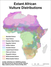 The African vulture trade involves the poaching, trafficking, and illegal sale of vultures and vulture parts for bushmeat and for ritual and religious use, like traditional medicines, in Sub-Saharan Africa. This illegal trade of vultures and vulture parts is contributing to a population crisis on the continent. In 2017, the IUCN Red List categorized 7 of Africa's 11 vulture species as globally endangered or critically endangered.[1] Recent research suggests that 90% of vulture species declines in Africa may be due to a combination of poisoning and illegal wildlife trade for medicinal use and/or bushmeat.[2] All trade of African vultures is illegal, as these birds are protected by international laws.[3]
