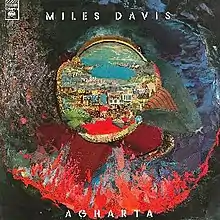 Agharta's North American release had different artwork designed by John Berg, the art director from Davis' U.S. label, Columbia Records.[68] In its liner notes, an inscription said the record should be listened to at the highest possible volume, and the arrangements were credited to Davis.[69] After it was released, Macero received a complaint from Columbia's accounting department about the trumpeter being compensated $2,500 per arrangement, arguing that none of the music sounded as if it had been arranged.[70]