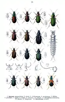 Agonum species (and Anchomenus dorsalis in lower right corner) from Edmund Reitter's Fauna Germanica (1908)