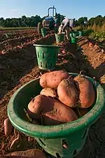 When the sweet potato is brought to market it is processed into things like flour, bread, and beverages are made. Northern Ghana has not been able to take full advantage of this food source, in every part of the country, because some of the land is not fertile, and a complex socioeconomic limitation such as many farm owners not being able to come together.[26] This causes a disruption in the market. There is this mistrust among the local farmers because most of the farmers have different opinions on how the product should be marketed. There are five groups of people that help get the Sweet potato to market, the Farmers, traders, commission agents the processors and final the consumers. They all deal with each other in a private and individuals basis.[26] Transportation of the sweet potato is mostly done by outside source such as hired transportation.[27]