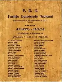 Justo expressly sought to distance himself from Uriburu, who counted on a large group of supporters among the military officials but could not get the same support from the political parties, which quickly divided themselves after Yrigoyen's death, the focus of the antipathy against him. He rejected the vice-presidency that Uriburu offered him, and he only briefly accepted the command of the army, resigning soon after. In Buenos Aires Province, Uriburu did not manage to implement the corporate model with which he wished to replace the republican system, and this failure cost him the political career of his Interior Minister, Matías Sánchez Sorondo. Justo again rejected the offers of Uriburu to join the government and form a coalition. With the support of an alliance of the conservative National Democratic Party, the Independent Socialist Party, and the most anti-personalist faction of the Radical Party (then to be the Coalition of Parties for Democracy), he ran for president on the elections of 8 November 1931. With Yrigoyen's faction banned from the elections and its supporters using the strategy of "revolutionary abstention", Justo easily won against Lisandro de la Torre and Nicolás Repetto, although under suspicion of fraud. Julio Argentino Roca Jr., from the conservative faction, joined him as vice-president.[6]