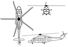 Dependent on the configuration, the AW189's cabin can accommodate up to 19 passengers and two crew members on crashworthy seats.[5] According to AgustaWestland, the AW189 possesses the largest cabin in its class, which is accessed via large sliding doors on either side of the fuselage; a separate externally accessed baggage compartment is also present.[21] The interior is customised to the mission role being undertaken; these include a self-contained emergency medical service (EMS) layout, passenger configurations (with in-flight entertainment systems offered), mission consoles for SAR and law enforcement operations, and an optional dividing wall between the cockpit and main cabin may also be installed.[22] Under certain conditions and limitations, the rotorcraft can be flown by a single pilot.[5] Various pieces of optional equipment can be installed upon the AW189, including fast roping kits, external electric hoist, cargo hook, air conditioning, auxiliary fuel tanks, mission console, emergency flotation system (certified up to Sea State 6), external life rafts, emergency lighting, external search light, main cabin bubble windows, wire strike protection system, de-icing systems providing multiple levels of protection.[22][21]