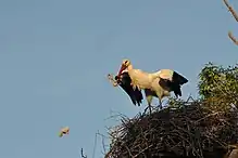 A white stork (Ciconia ciconia) throwing offspring out of the nest near El Cortalet.